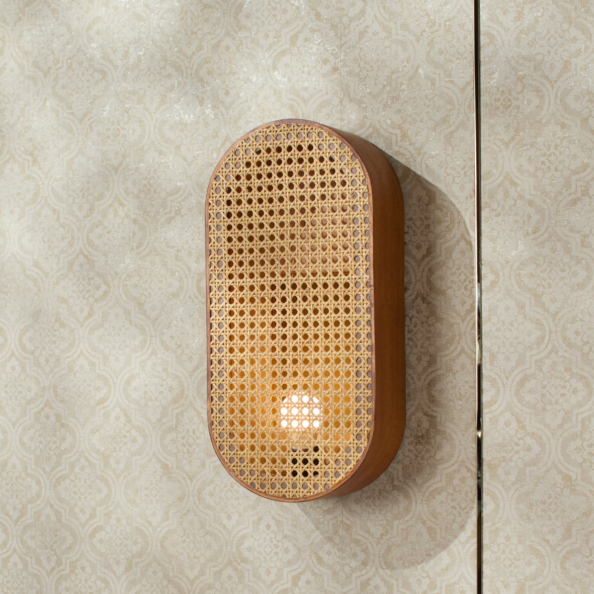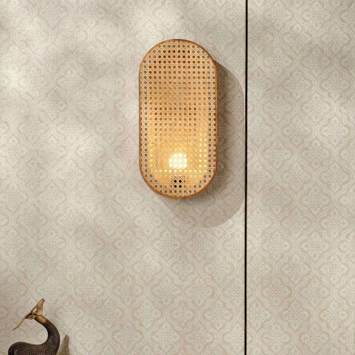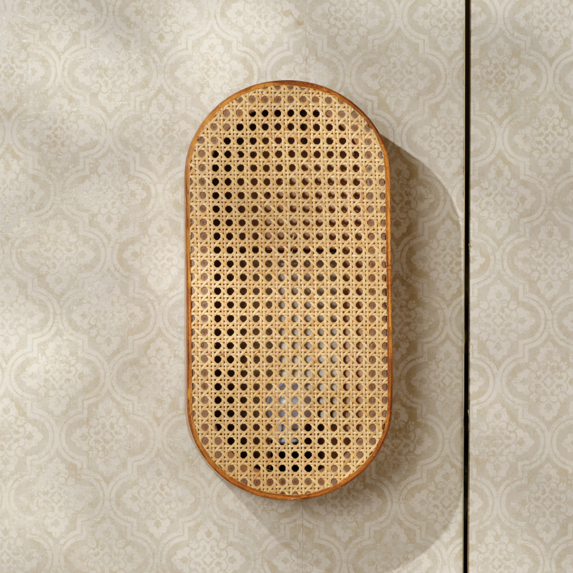 Andakara Chitra – Vintage Charm, features a rattan-inspired design that evokes a sense of warmth and timeless nostalgia. Crafted in a graceful oval-shaped light form, the pattern reflects natural beauty and vintage charm. Made with rattan material that softly diffuses light and complemented by a refined wooden finish, it includes an attached bulb holder inside. With careful attention to detail, it emits a gentle glow while also serving as a stylish décor piece.