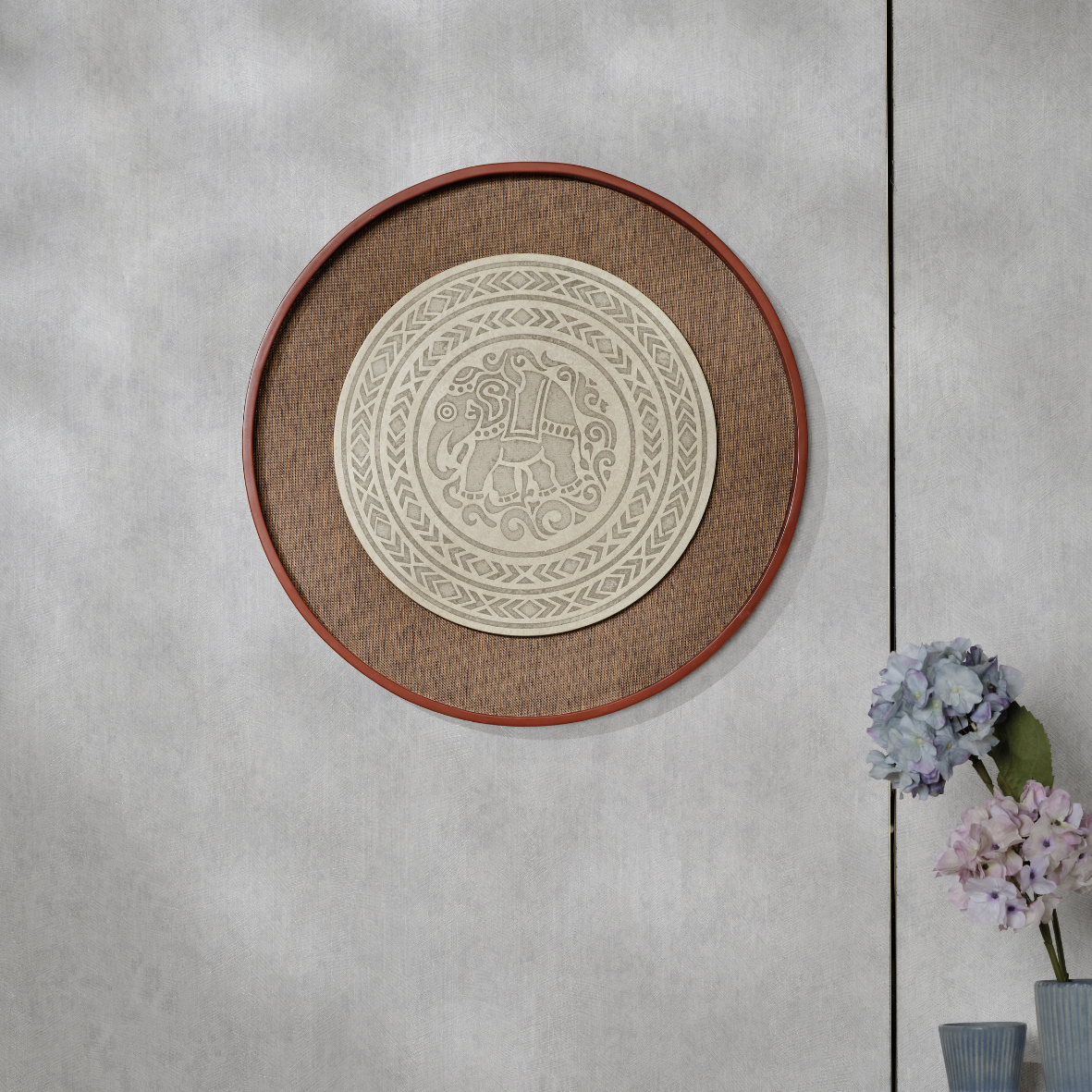 Pracira Chitra – Gaja Chakra is a striking circular wall hanging inspired by ornamental roundels found in temple architecture, palace carvings, and procession chariots from the Chola, Vijayanagara, and Nayaka periods. Featuring a majestic elephant symbolizing wisdom, strength, and auspiciousness, the design reflects traditional grandeur. Crafted with blind material and a refined wooden finish, with an engraved cement plate at the center, it showcases intricate detailing and elevates your decor beautifully.