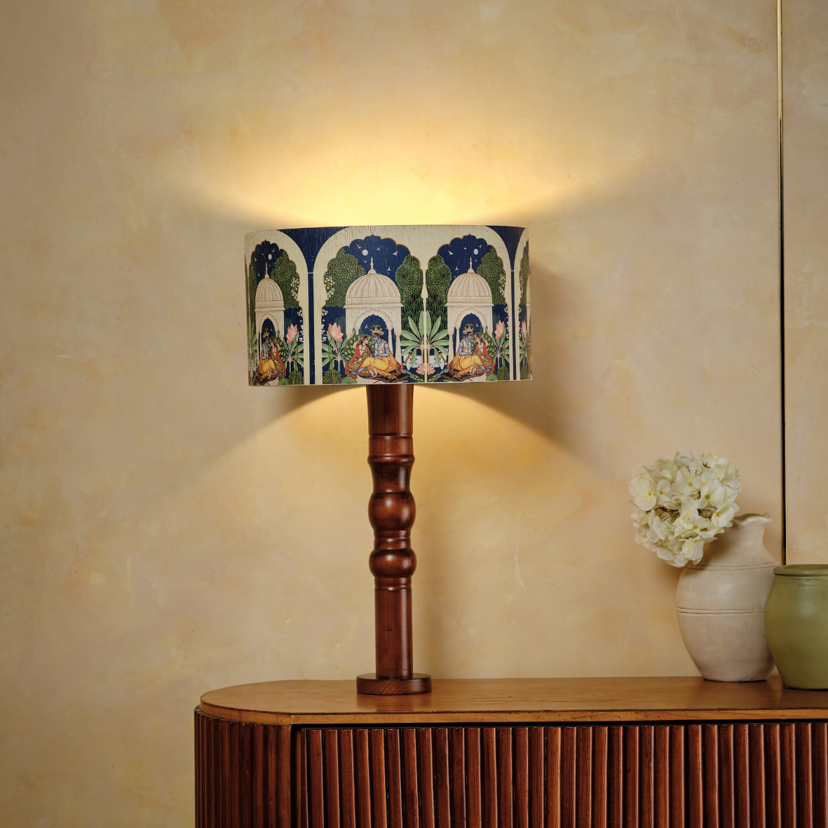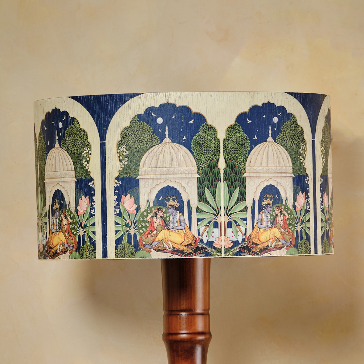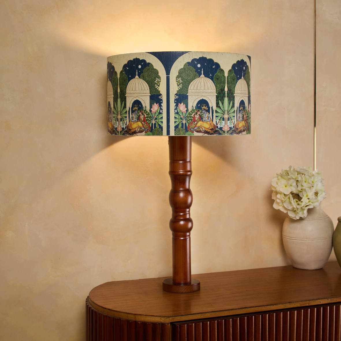 Sadvrtti Pidam – The Romanesque is a graceful lamp inspired by heritage storytelling. Its intricately designed shade depicts Radha and Krishna seated in a serene garden, surrounded by delicate motifs that celebrate romance and devotion. Crafted with flexy wood and finished with exceptional attention to detail, the lamp blends classic artistry with refined elegance, casting a soft, warm glow that enriches interiors with timeless beauty and charm.